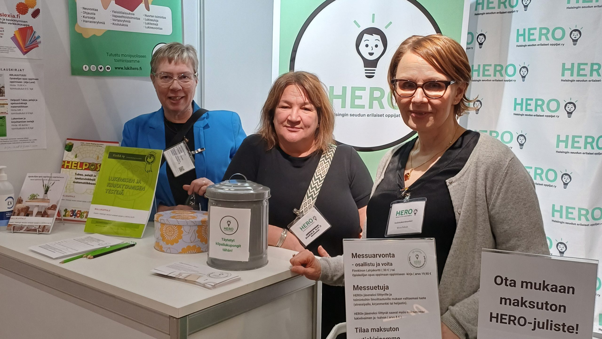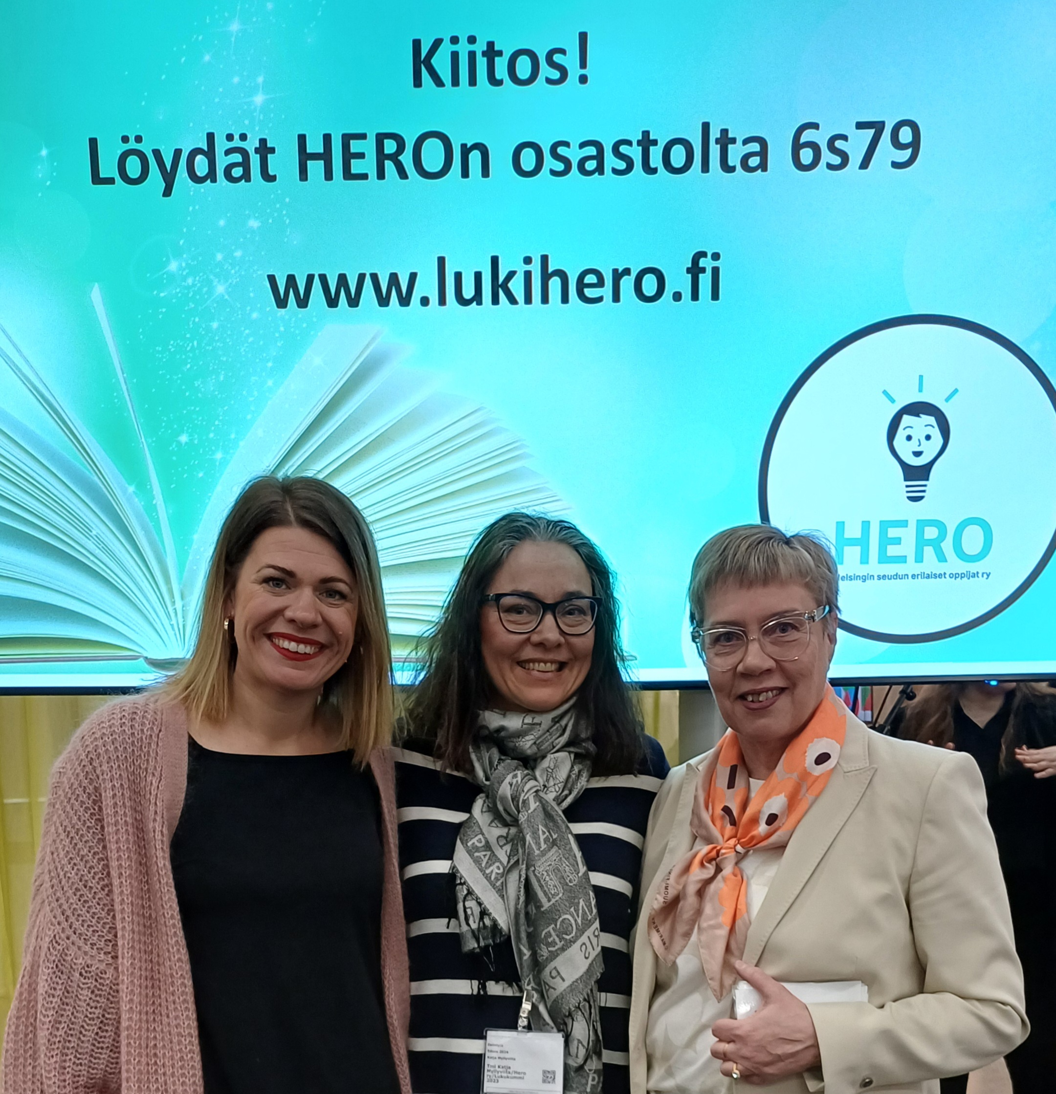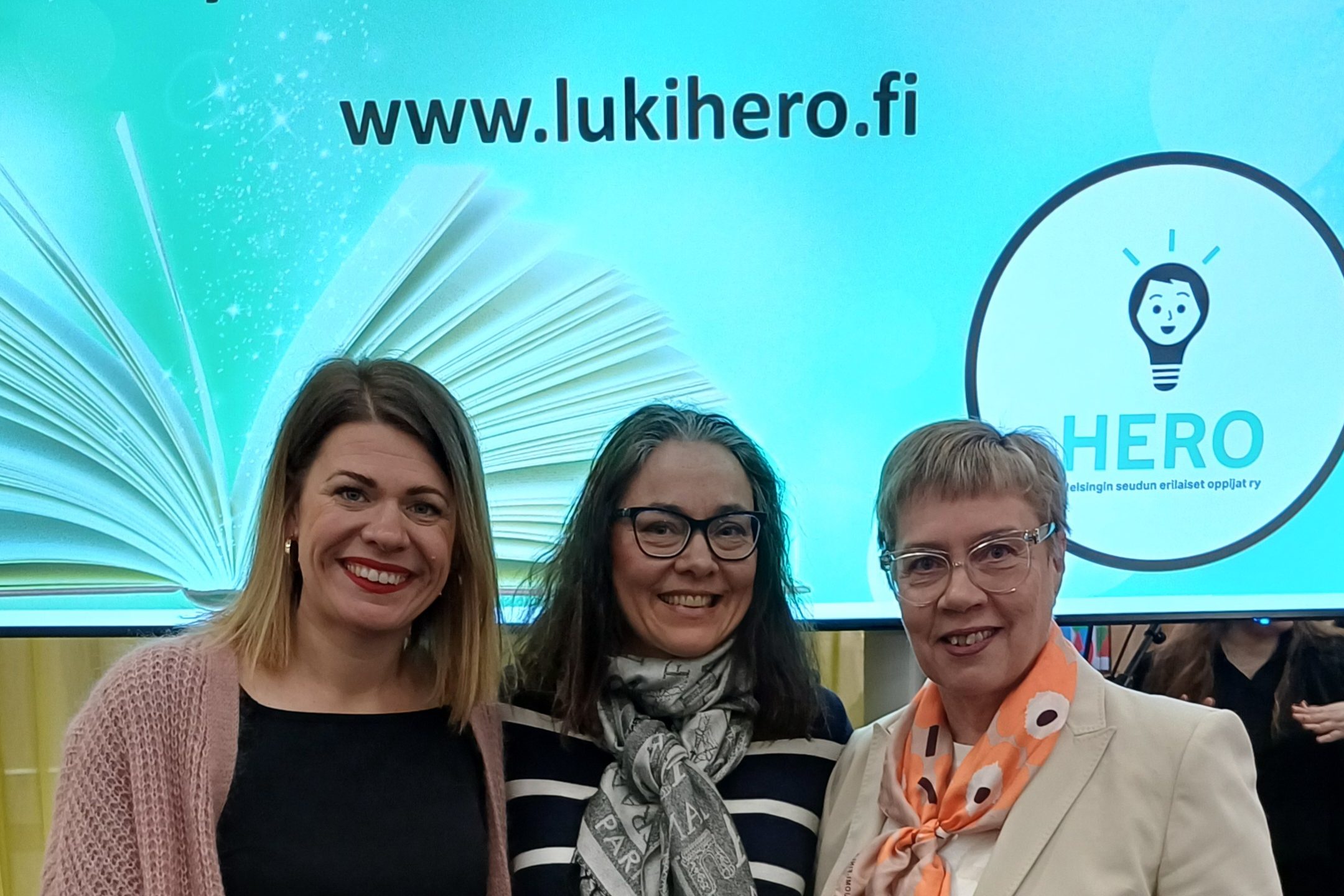Kuvassa vasemmalla tuore HEROn Lukukummi 2024 Inari Fernández, keskellä viime vuoden Lukukummi Katja Myllyviita ja oikealla HEROn toiminnanjohtaja Suvi-Päivikki Hiipakka.