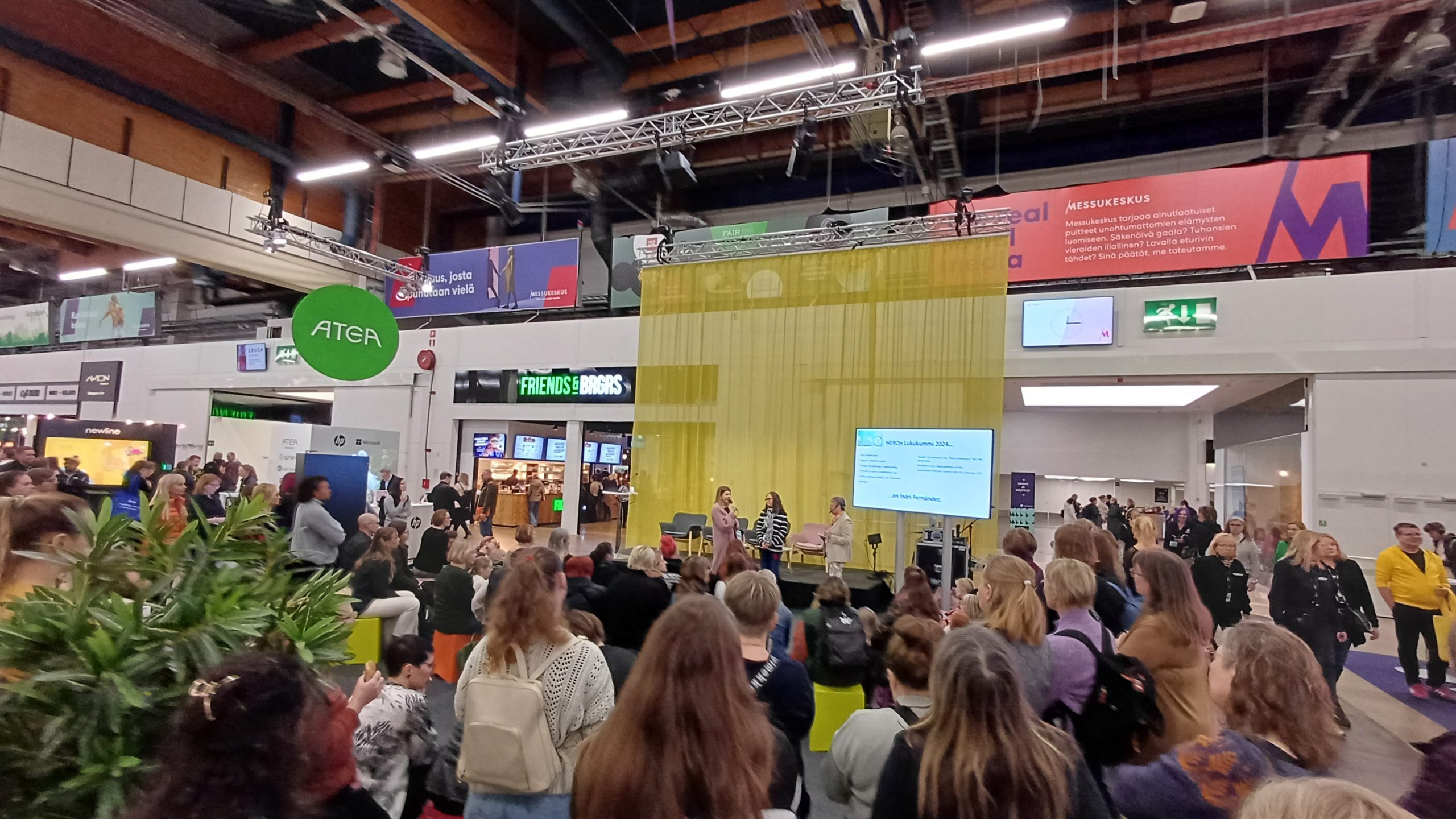 Kuva kertoo, että HEROn ohjelma kiinnosti yleisöä. Ohjelmalavan istumapaikat olivat täynnä, mutta onneksi messukäytäville mahtui kuuntelemaan.