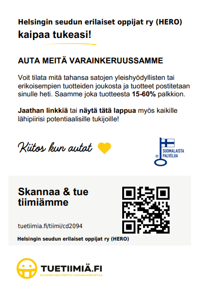 - HEROn myyntilinkki ohjaa ostoksesi yhdistystuen automaattisesti HEROlle. (Mutta mikäli et kirjaudu myyntilinkin kautta, tuki ohjautuu HEROlle kun ilmoitat tiimikoodin cd2094 kassalla.)