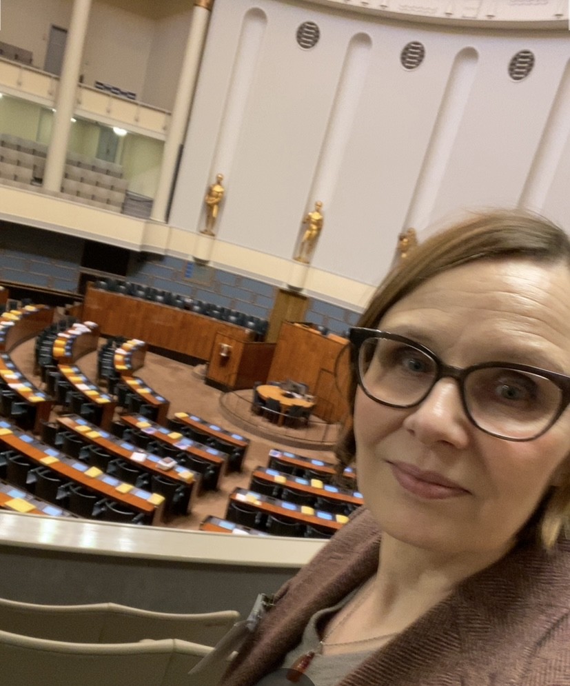 Eduskunta on todella upea rakennus. Ulkoapäin jykevä, pelkistetty ja karu, mutta sisältä täynnä herkkää kauneutta ja mielenkiintoisia yksityiskohtia, joita en kaikkia voi tässä tekstissä avata, koska pituudella on rajansa. Minuun teki muun muassa suuren vaikutuksen marmorinen portaikko kullatuin kaitein sekä rakennuksen kansallismuseon päädyn lattiamosaiikki, joka kertoi Suomen talouden ja yhteiskunnan pilareista kautta historian: teollisuudesta, maataloudesta, metsästä ja kaupankäynnistä. Pienenä viehättävänä detaljina opin, että kansanedustajien kaappien sisältä löytyvät lämmittimet, jotka kuivattavat sateen kastelemat ulkovaatteet työpäivän aikana. Hämmästelin moneen otteeseen kierroksen aikana, että tämä on todellakin monen henkilön arjen työpaikka ja hyvin erilainen kuin oma vaatimaton huoneeni vain korttelin päässä.